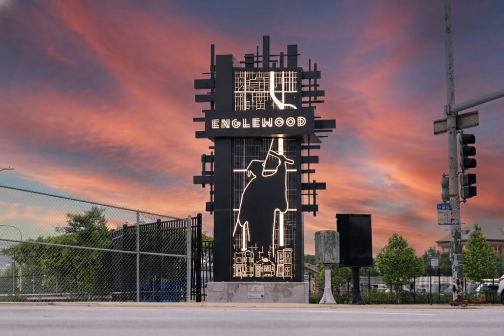 | Artwork Title: ASPIRE Medium: Plasma cut aluminum, steel & LEDs Dimensions: 8’ x 5’ x 25’ Location: Chicago | Englewood Year Completed: 2023 Created for Sterling Bay with construction and architectural design support from Skender and LJC. |