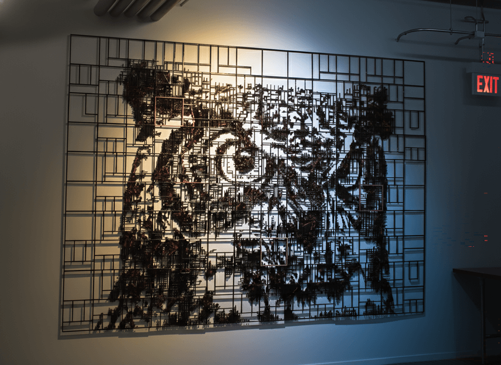 | Artwork Title: Mapped Medium: Wood & Mixed Media Dimensions: 10’ x 32’ x 2’ Location: Chicago Year Completed: 2017 Created for MHUB |